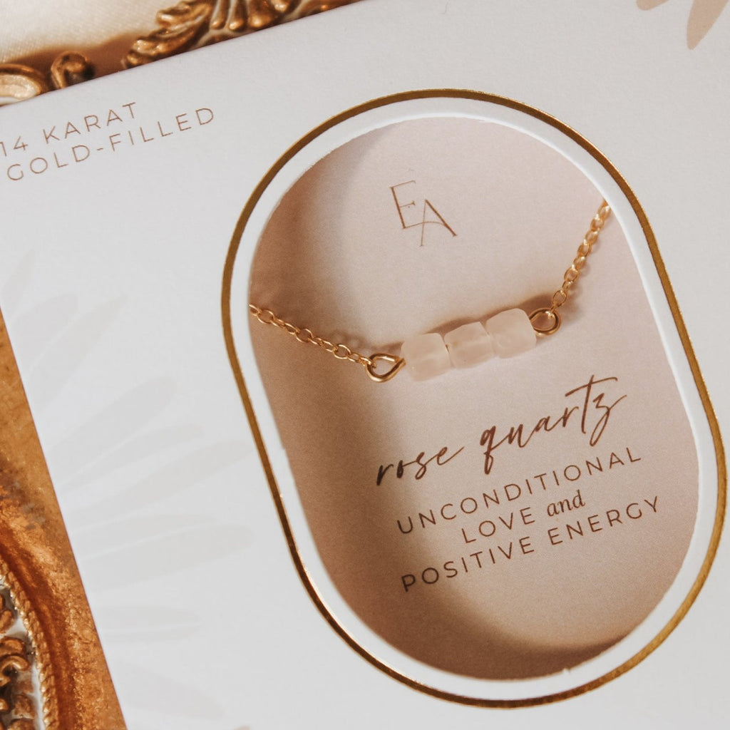 Each necklace comes beautifully packaged on a card adorned with the words "unconditional love and positive energy," capturing the essence of rose quartz and adding an extra touch of heartfelt sentiment to your gift-giving experience.