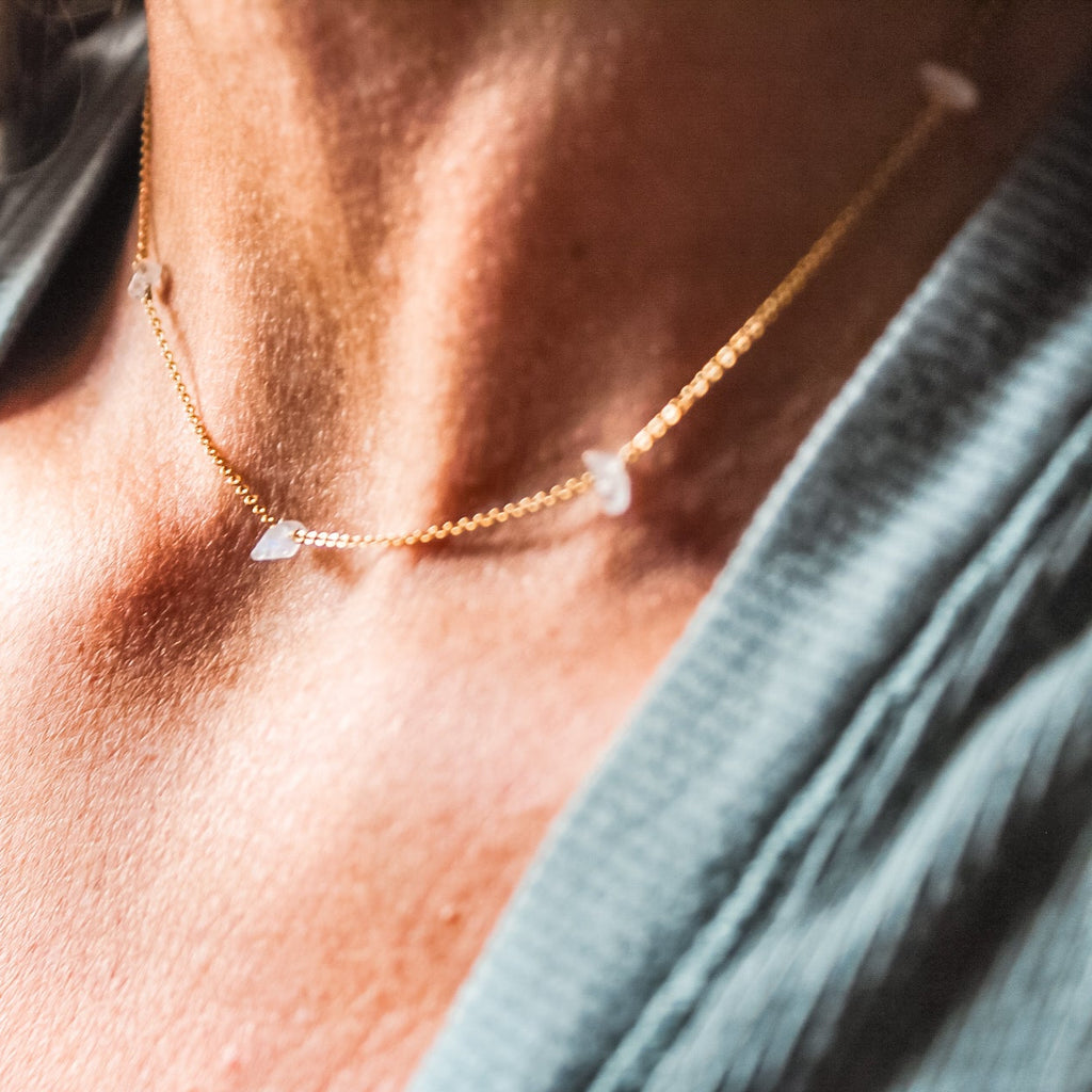 Each necklace is crafted with tiny 3mm genuine moonstone chips, spaced delicately along your choice of sterling silver or 14k gold filled chain. Designed in a choker style, it sits gracefully along the neckline — stunning on its own or layered with your favorite chains for an effortless boho-luxe vibe. 15 inch chain with a one inch extender.