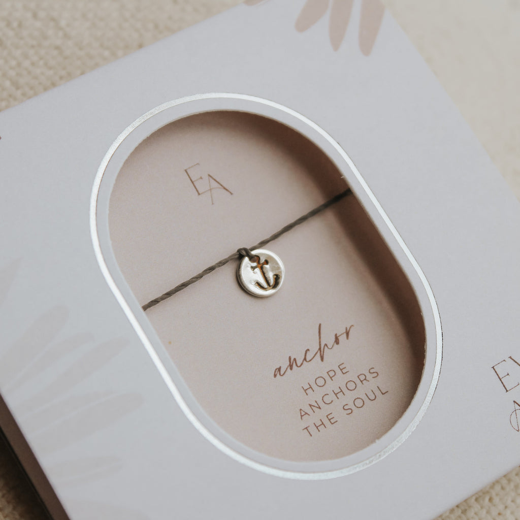 Our hand-stamped anchor cord bracelet is the perfect accessory for beach or boat lovers. The 6mm charm, available in sterling silver or gold-filled, is attached to a strong and durable gray poly cord that can get wet without damage. The adjustable closure ensures a comfortable fit for most wrist sizes.