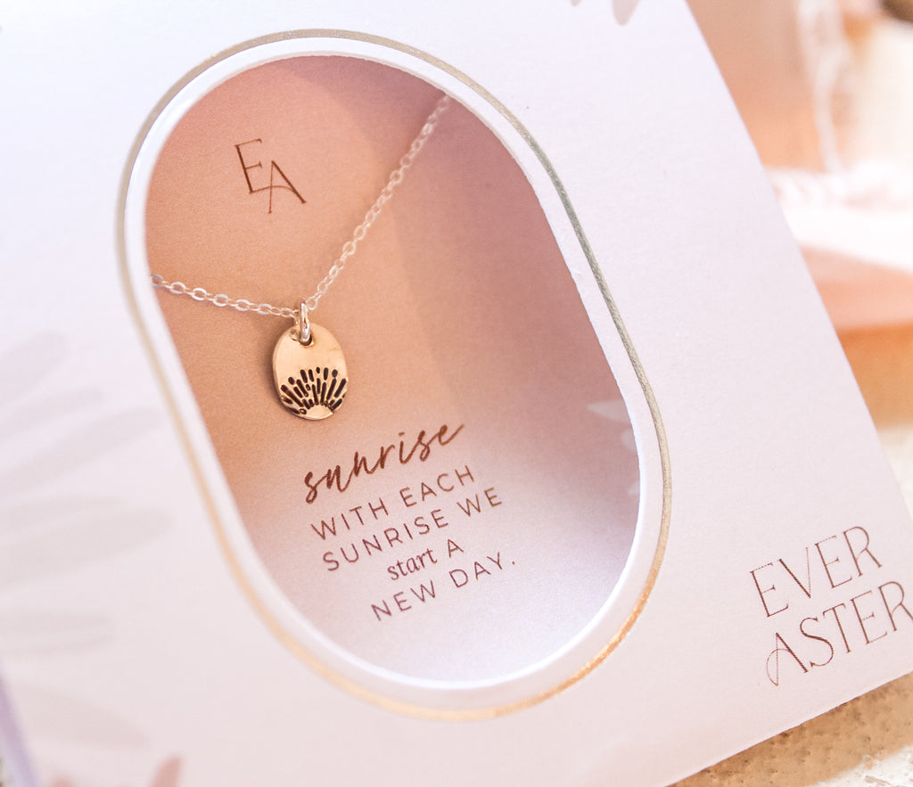 This tiny oval charm (6x8mm) is hand stamped with a delicate sunrise design — a symbol of hope, renewal, and new beginnings - and attached to a beautiful, simple chain. The necklace comes in your choice of sterling silver or 14k gold-filled chain, this necklace is intentionally dainty and minimalist — perfect for everyday wear or layering with other favorites.