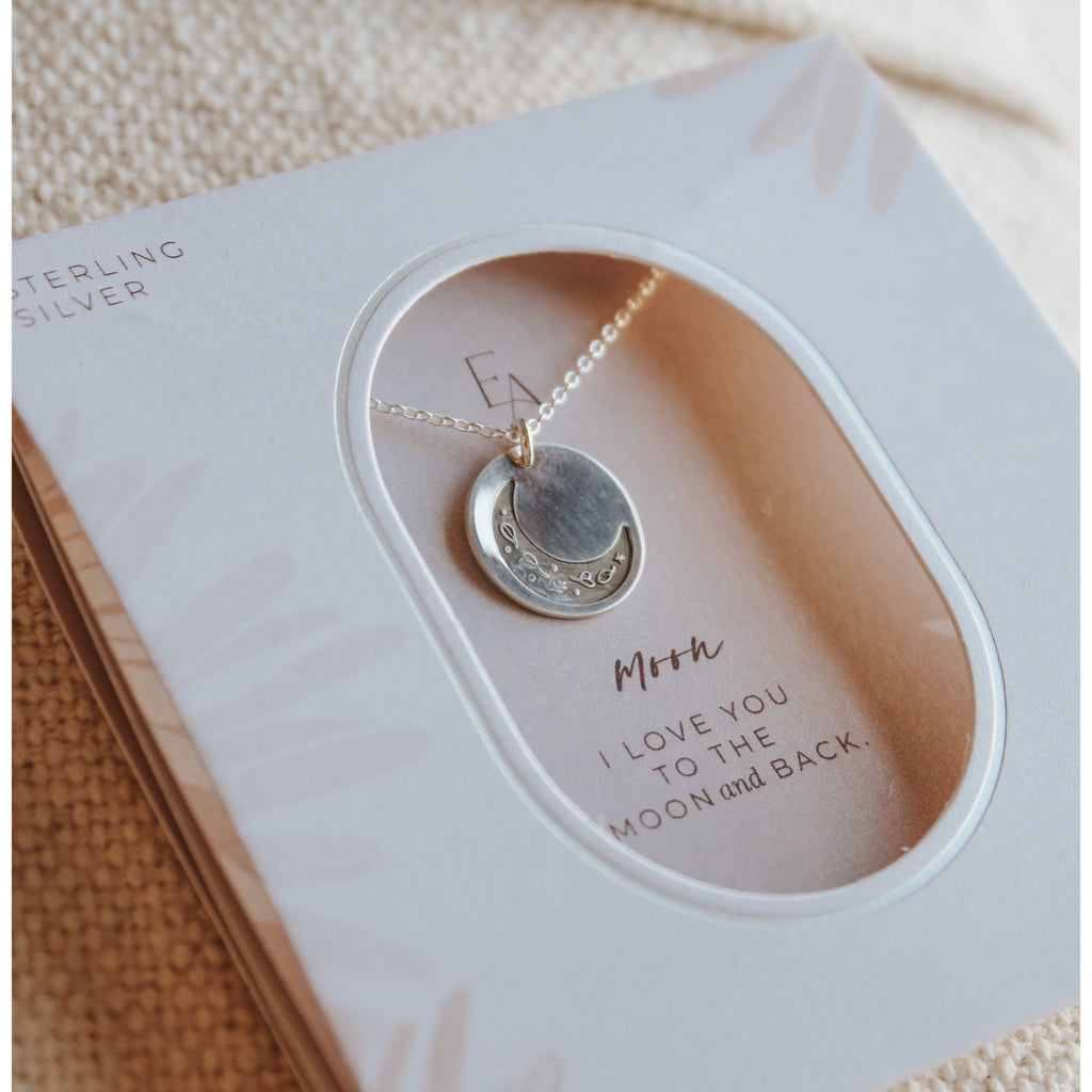 I Love you to the moon and back. The perfect gift to show your love. Simple and meaningful, this necklace has beautiful leaf details inside of the moon design.
