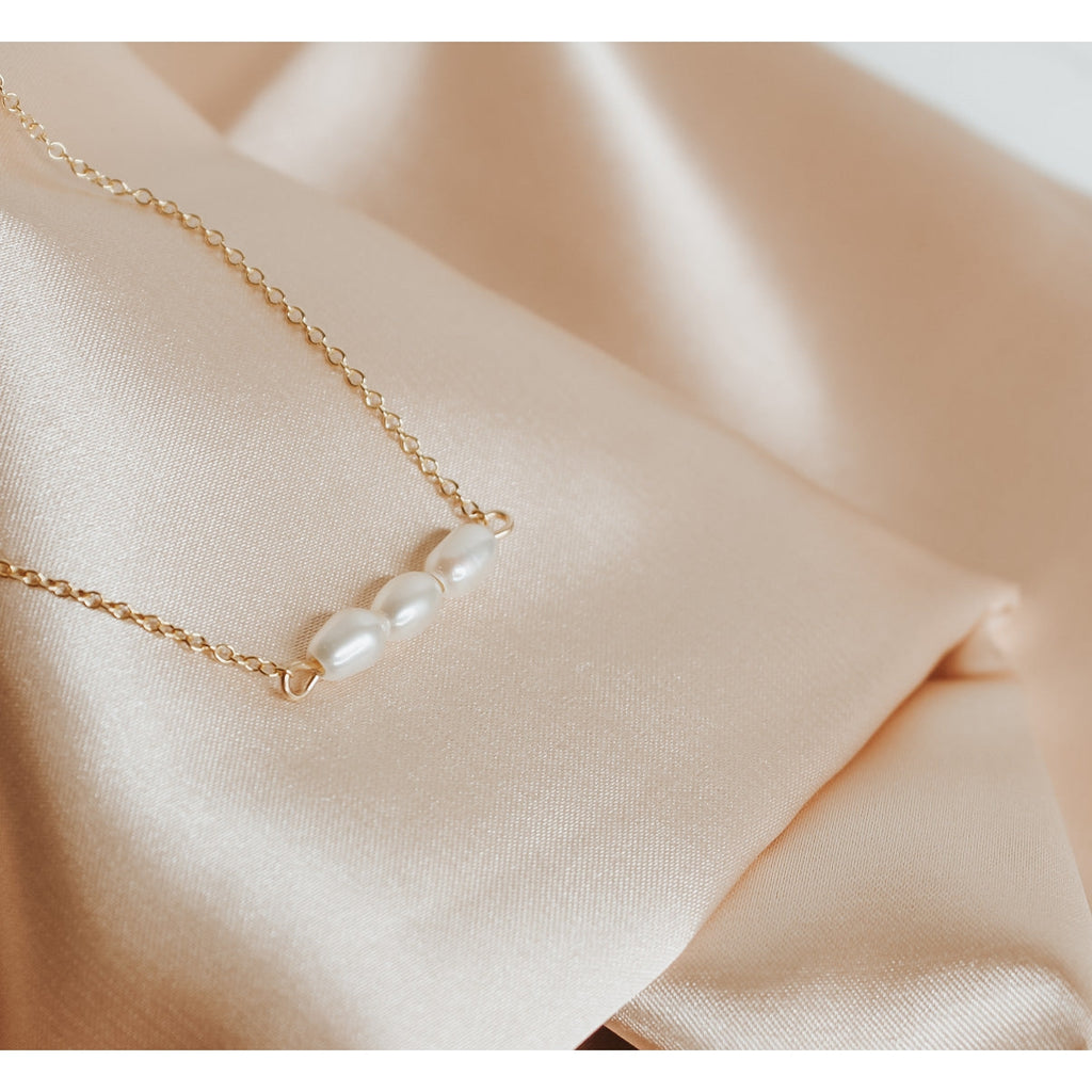 Upgrade your look with the Pearl Anne Necklace. This necklace features 3 off-white freshwater pearl beads measuring 5x4mm, strung on a delicate chain made of your choice of gold-filled or sterling silver. The chain is adjustable from 16 to 18 inches, making it the perfect fit for any neck size. For those who prefer a longer length, a 2-inch necklace extender can be purchased separately.