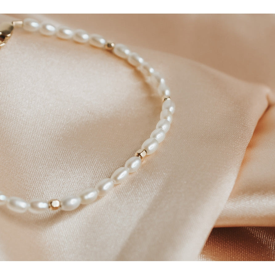 This beautiful pearl bead bracelet features off-white freshwater pearls measuring 3x4mm, accented by faceted gold-filled beads measuring 2.5mm. The bracelet is available in two sizes: 6.5-7 inches or 7-7.5 inches, and has a lobster clasp closure for a secure fit. This bracelet makes a perfect gift for mom, friend, or even yourself.