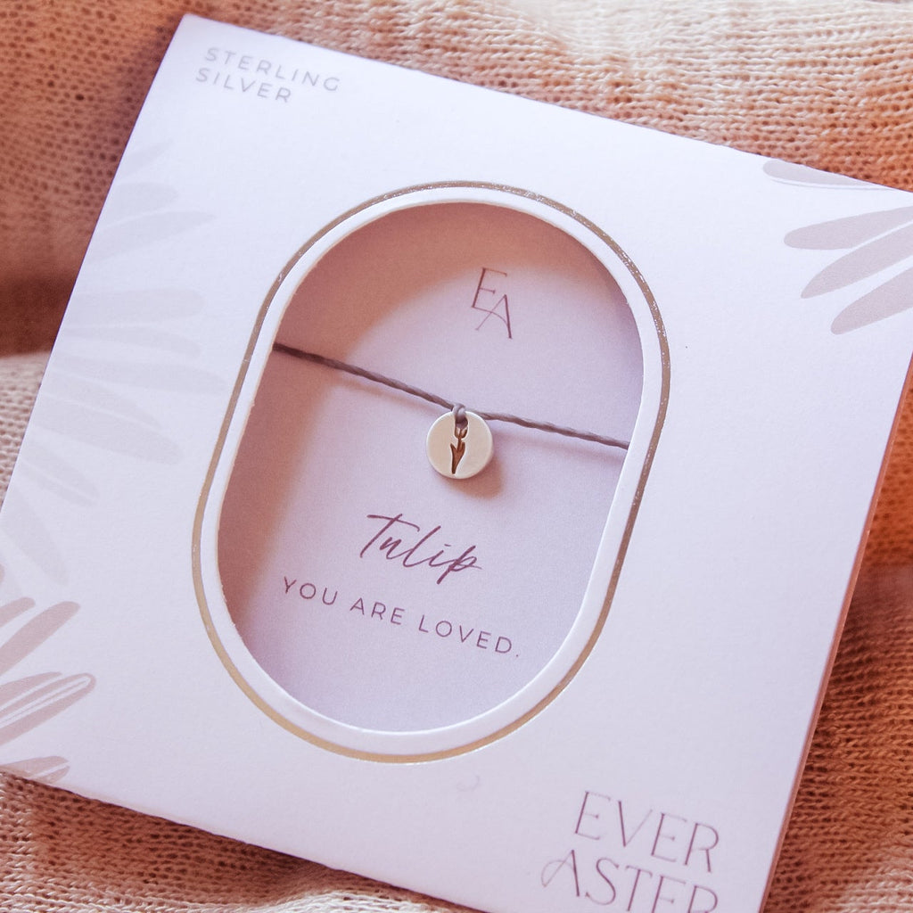 Carry a daily reminder of love with this dainty Tulip Cord Bracelet. A tiny tulip is hand-stamped on a 1/4" charm and strung on a soft grey poly cord that’s durable enough to wear every day—even in water. The adjustable sliding bead closure ensures a comfortable fit for most wrist sizes.